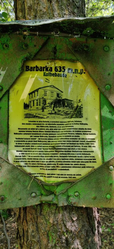 Dawne Schronisko Kolbebaude na Barbarce Schronisko, SzczytSchronisko powstało w 1894 roku. Ze szczytu roztaczały się piękne widoki na okolicę. Schronisko zostało podpalone w 1946 roku. |