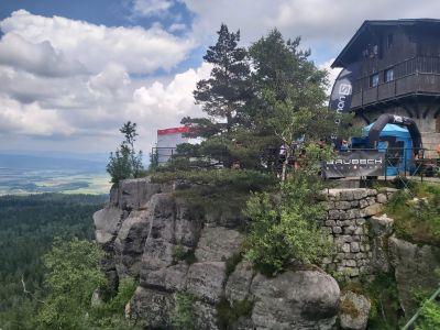 Chełmiec Punkt widokowy, Szczyt, Wieża widokowaSzczyt góry Chełmiec, drugiego co do wielkości w Górach Wałbrzyskich. Wbrew obiegowej opinni nie jest to wulkan, góra nie powstała w wyniku działalności wulkanicznej tylko plutonicznej. Jest to lakkolit, czyli intruzja magmy która nie wydos |