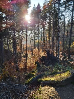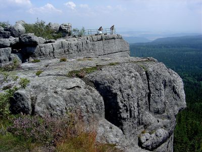 Husyckie Skały Forma Skalna, Punkt widokowyHusyckie Skały (Kutschenstein) (545 m n.p.m.) - to okazałe granitowe urwisko z 20 metrowymi skalnymi ścianami i punkt widokowy. |