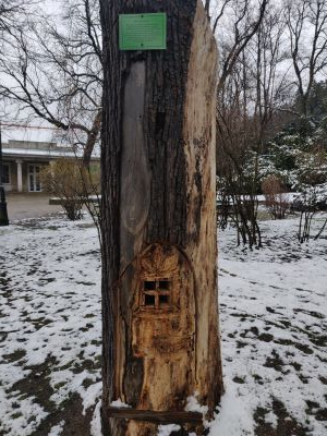 Domek skrzatówRzeźba w martwym pniu drzewa. |