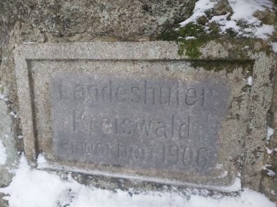 Zadzierna - tablica pamiątkowaWmurowana w skałę kamienna tablica z napisem "Landeshuter Kreiswald, erworben 1906" |