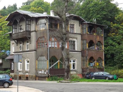 Willa BarbaraBudynek nr 34 w Sokołowsku do przedwojenny pensjonat. Dziś zwykły dom mieszkalny. Uwagę przykuwa elewacja budynku, która ma wiele drewnianych wtrąceń. |