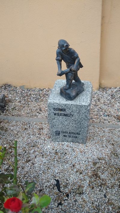 Górnik wiertniczyRzeźba górnika wiertniczego znajduje się tuż za budynkiem bramnym po lewej stronie przy murze. Górnik ma symbolizować wiercenie na przodku chodnika kopalnianego, w celu uzyskania urobku. |