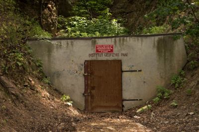 Wejście do podziemi KsiążaWejście do sztolni po zamkiem Książ, obecnie siedziba Instytutu Geofizyki PAN |