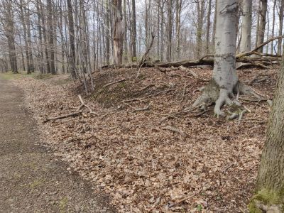 Średniowieczny wał ziemnyWał ziemny będący pozostałością umocnień grodziska które stało tu w średniowieczu. |